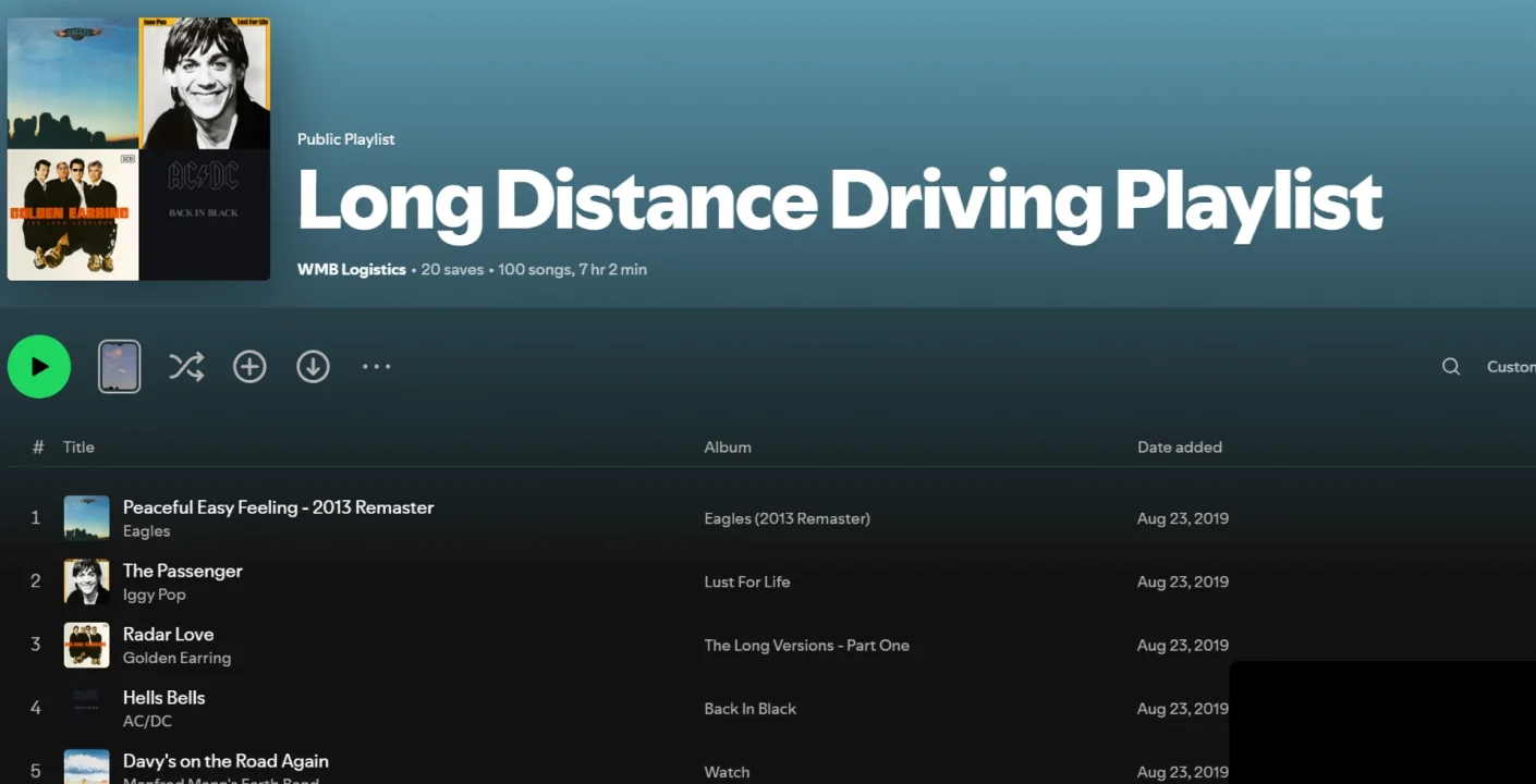 So, we went ahead and created a playlist on Spotify, with all of your recommendations. It’s aptly named ‘Long Distance Driving Playlist’ so that it’s easy to find, is made up of 100 songs and features some of the best artists and bands of all time, including: